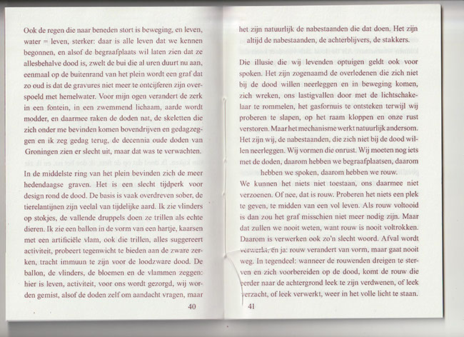 “Die illusie die wij levenden optuigen geldt ook voor spoken. Het zijn zogenaamd de overledenen die zich niet bij de dood willen neerleggen en in beweging komen, zich wreken, ons lastigvallen door met de lichtschakelaar te rommelen, het gasfornuis te ontsteken terwijl wij proberen te slapen, op het raam kloppen en onze rust verstoren. Maar het mechanisme werkt natuurlijk andersom. Het zijn wij, de nabestaanden, die zich niet bij de dood willen neerleggen. Wij vormen die onrust. Wij moeten nog iets met de doden, daarom hebben we begraafplaatsen, daarom hebben we spoken, daarom hebben we rouw.”
