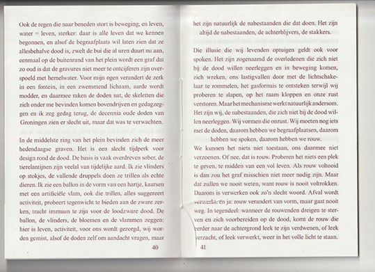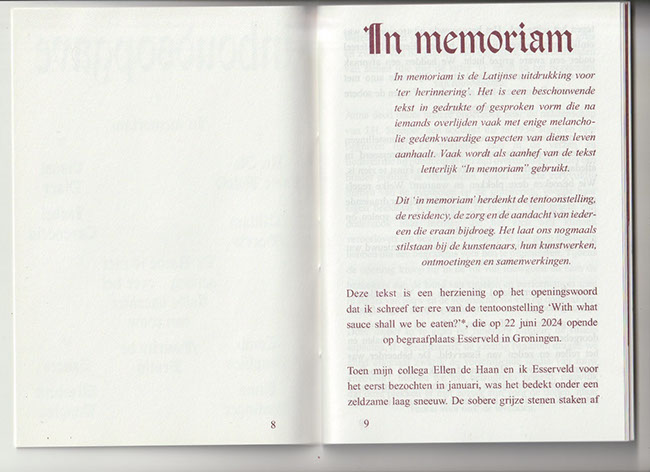 en ) The publication was developed during a residency and exhibition at Esserveld Cemetery, for which Anna Reutinger, Isabel Cavenecia and Yair Callender developed new artwork. With contributions by Maurits de Bruijn, Anna Reutinger, Isabel Cavenecia, a story by William Morris and recipes by Elizabeth Douglas. Texts are published in the written language.