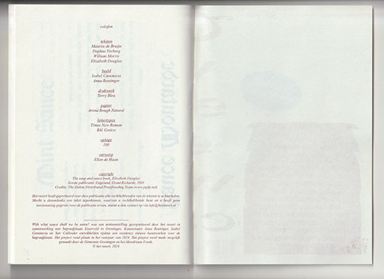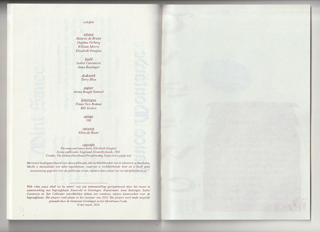July, 2024 / isbn: 978-90-831386-3-3 / pages: 80 / size: 14x20cm / edition: 100 / fonts: Times New Roman & R41 Gotico / print: Terry Bleu / design: Ellen de Haan / writer: Maurits de Bruijn / texts: Daphne Verberg, William Morris, Elizabeth Douglas / images: Isabel Cavenecia & Anna Reutinger / self-published by het resort