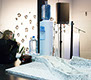 AlS HET RESORT DE PLEK IS WAAR KUNSTENAARS TOT RUST KUNNEN KOMEN, DAN IS WATER HET ESSENTIËLE ELEMENT TER VERKOELING. Tussen het harde werk door in de aanloop naar de presentatie in De Machinefabriek vloeide het water ook rijkelijk als dorstlesser. Bij aankomst krijgen wij (Anna-Rosja Haveman en Vanessa van ’t Hoogt) op een warme lentedag een glas water aangeboden. De drie waterkoelers blijken deel te zijn van een spontaan ontstane installatie in samenwerking tussen de kunstenaars: Maaike Knibbe (1988), Bart Nijstad (1979) en Philippe Wolthuis (1979). De waterkoeler staat symbool voor een gedeelde fascinatie en de wisselwerking tussen de drie kunstenaars, als gevolg van de gezamenlijke werkruimte.