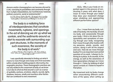I was specifically interested in finding out what it means to move through one’s body and what resonates within a body when building projects informed by choreographic practices. These choreographic practices are not only related to the movement of body as we know it, but also to what we find around it, such as a sense of spatiality, vastness, emotions, objects, sounds, lights, shadows, textures, smells and countless other factors that can contribute to one’s movement." (...)