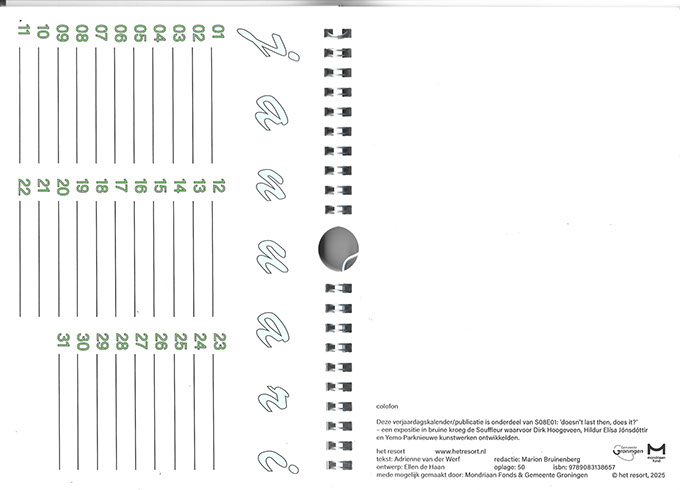 sep 2019 | size: 11x21 cm / pages: 36 (calender included) / print: digital B&W + color stickers / self-published by het resort / design: Ellen de Haan