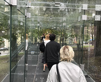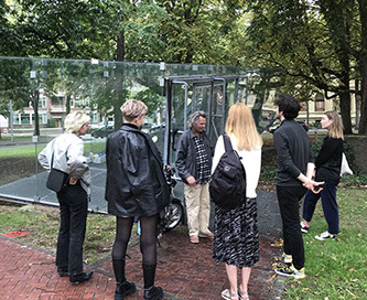 “On 23rd of September we all met at a former gay sauna now being inhabited by Het Resort. Briefly introducing each other we walked to see the Tschumi pavilion. That peculiar building made out of glass where every one of us have seen it but have never entered before. Here it is, a keyholder of Tschumi pavilion has been waiting for us. The doors are open, we can enter. Illuminating, we see every passerby, they see us walking inside, yet the feeling of isolation hits us. We feel safe, as if partially invisible. Sky becomes grey colour, rain starts pouring on a glass ceiling, we look up, feels like a waterfall. Anna Fleuri takes photos of our newly formed band. All set.
