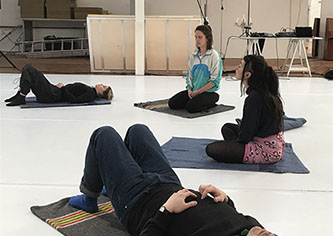 In the next segment, we participated in an interplay with a partner by bending, pulling, pushing and dragging each other's bodies to desired positions and movements of the body or limbs. In the last segment of the movement exercise, we played the roles of the oracle and the writer. While Eva was reading a piece of poetry through the PA speakers, the oracle moved through the space with the idea of the partner's art practice. The writer tried to read this in a form of automatic writing.