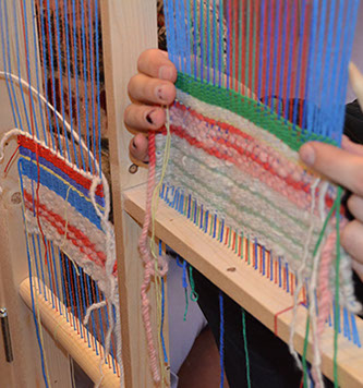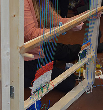 Marijke Klamer built a 3-piece loom-installation. A wooden frame with sculptures and stretched threads of self-spun wool and cotton, where people can work simultaneously. Creating one artwork together.