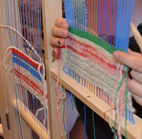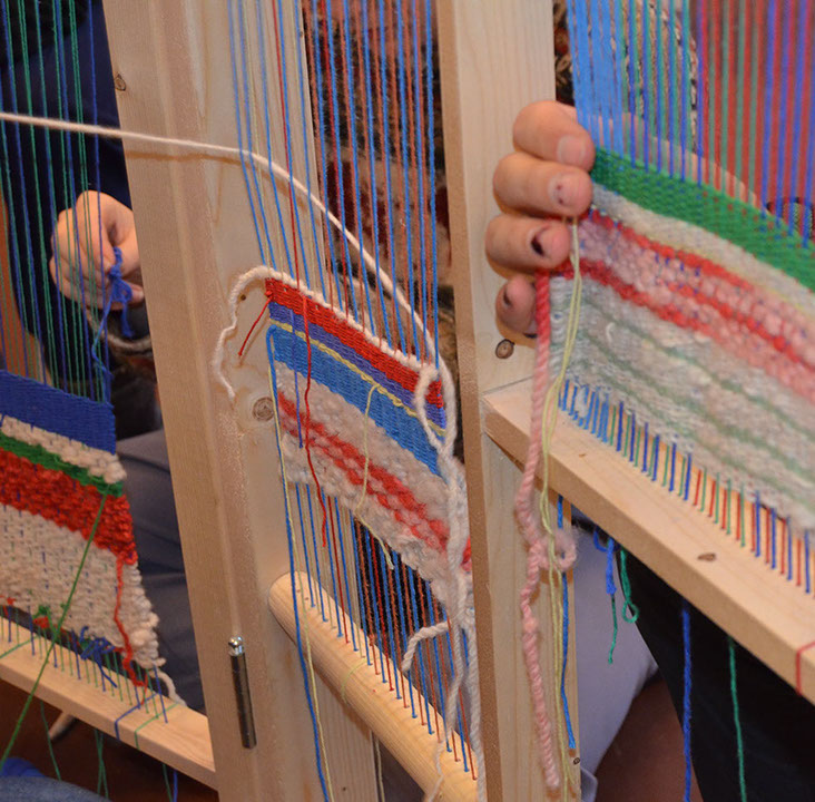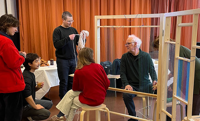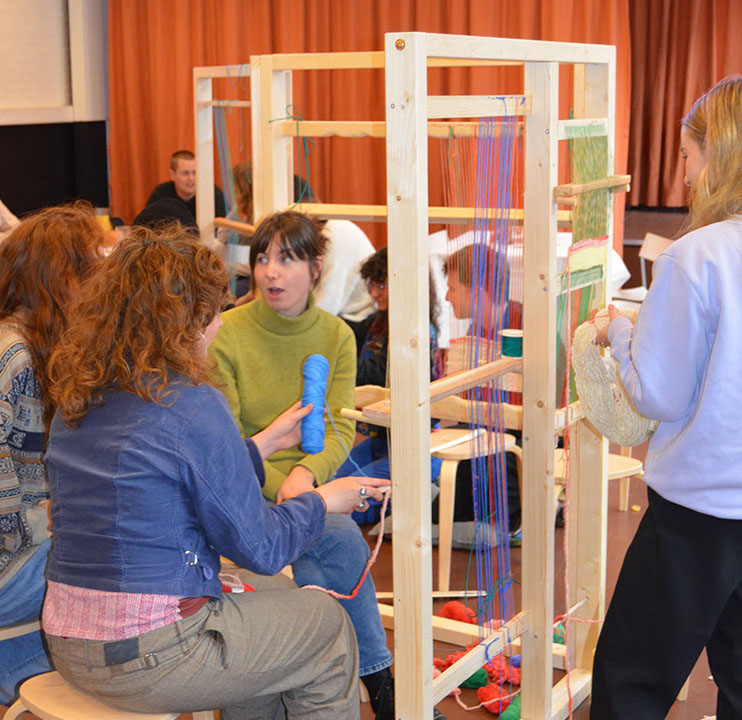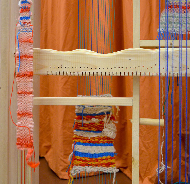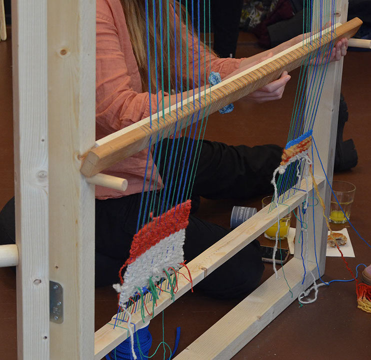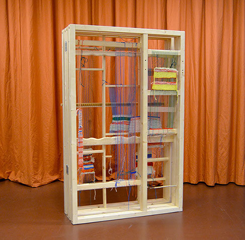 Marijke Klamer creëerde een 3-delige weefgetouw-installatie. Een houten frame met sculpturen en gespannen draden van zelfgesponnen wol en katoen, waar mensen tegelijkertijd aan kunnen werken. Om samen één werk te maken.